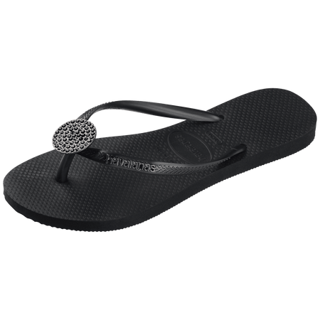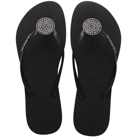 The Slim Crystal Glow flip flops are perfect for anyone looking for that final touch of comfort and sophistication in their look. A Slim model with thinner straps, this delicate sandal for women features a round pin with crystals on it. The iconic havaianas logo appears in metallic letters on the straps making this black flip flop for women a perfect way to upgrade your style.
